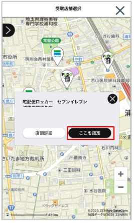 私の家の近くでは、セブンイレブンとファミリーマートが表示されていました。後はボタンを押して受け取り店舗を選択すれば完了。