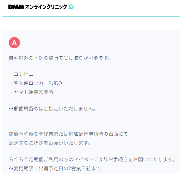 DMMオンラインクリニックはコンビニ受け取りはできますが、ドラッグストアへの配送や郵便局留めには対応していません。