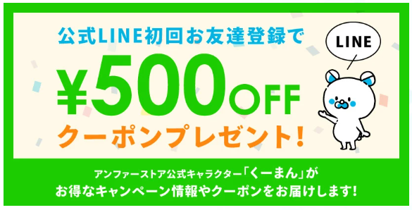 アンファーストア公式LINEと友だちになると、全商品に使える500円OFFクーポンがもらえます。