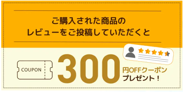 購入した商品のレビューを投稿すると、次回使える300円OFFクーポンがもらえます。全商品に使用できるため、2回目以降の購入時に活用できます。